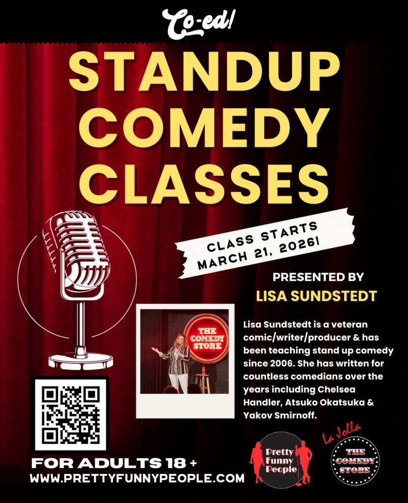 Each week you are given writing exercises and we’ll collaborate to come up with your best and funniest five minute set for you to showcase in front of a LIVE audience at the Comedy Store in La Jolla. Every student is NOT guaranteed a showcase spot. Spots are based on class attendance and promotion of show. Lisa will go over these details during class. The goal is to have everyone perform in front of a LIVE audience!